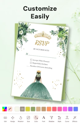 Dykk inn i en verden av designmuligheter med over 20 000 unike maler, skreddersydd for enhver tenkelig anledning – fra festlige festivaler til formelle konferanser. Redigeringsverktøyene i 1Invites gjør det enkelt å personalisere hver invitasjon med et rikt utvalg av fonter, klistremerker, bakgrunner og dekorative elementer. Du kan enkelt tilpasse kortene med dine egne bilder og farger, slik at hver invitasjon perfekt reflekterer arrangementets ånd og din personlige stil. Kreativ frihet møter brukervennlighet, og resultatet er profesjonelle, iøynefallende invitasjoner som skiller seg ut.